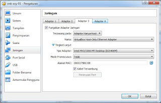 c Driver 3 (opsional), pilih Host only adapter agar aplikasi exambro admin tetap bisa dijalankan di komputer server yang bersangkutan, ini sifatnya opsional jika komputer server belum terhubung ke client.